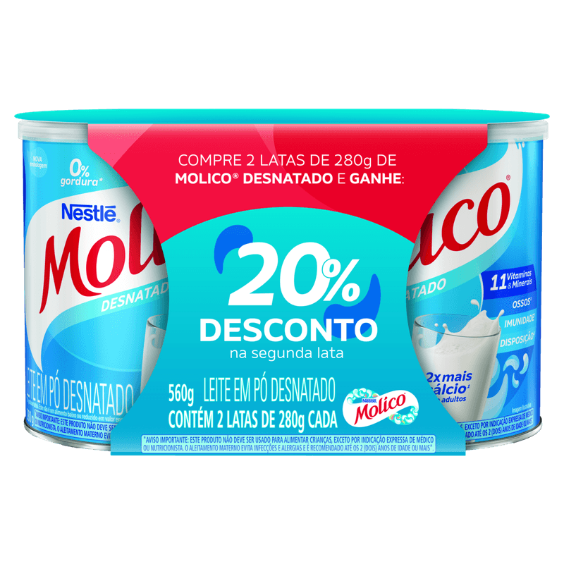 Leite MOLICO Desnatado com 2 unidades de 280g cada 20% de Desconto na Segunda Unidade